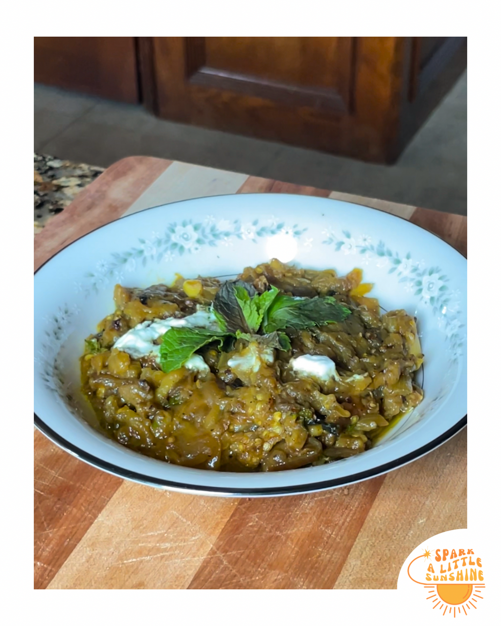 • Add kashk, one tablespoon fresh mint (.33) and bloomed saffron to the eggplant mixture and stir well. Cook 8-10 minutes more so all the flavors marry together.