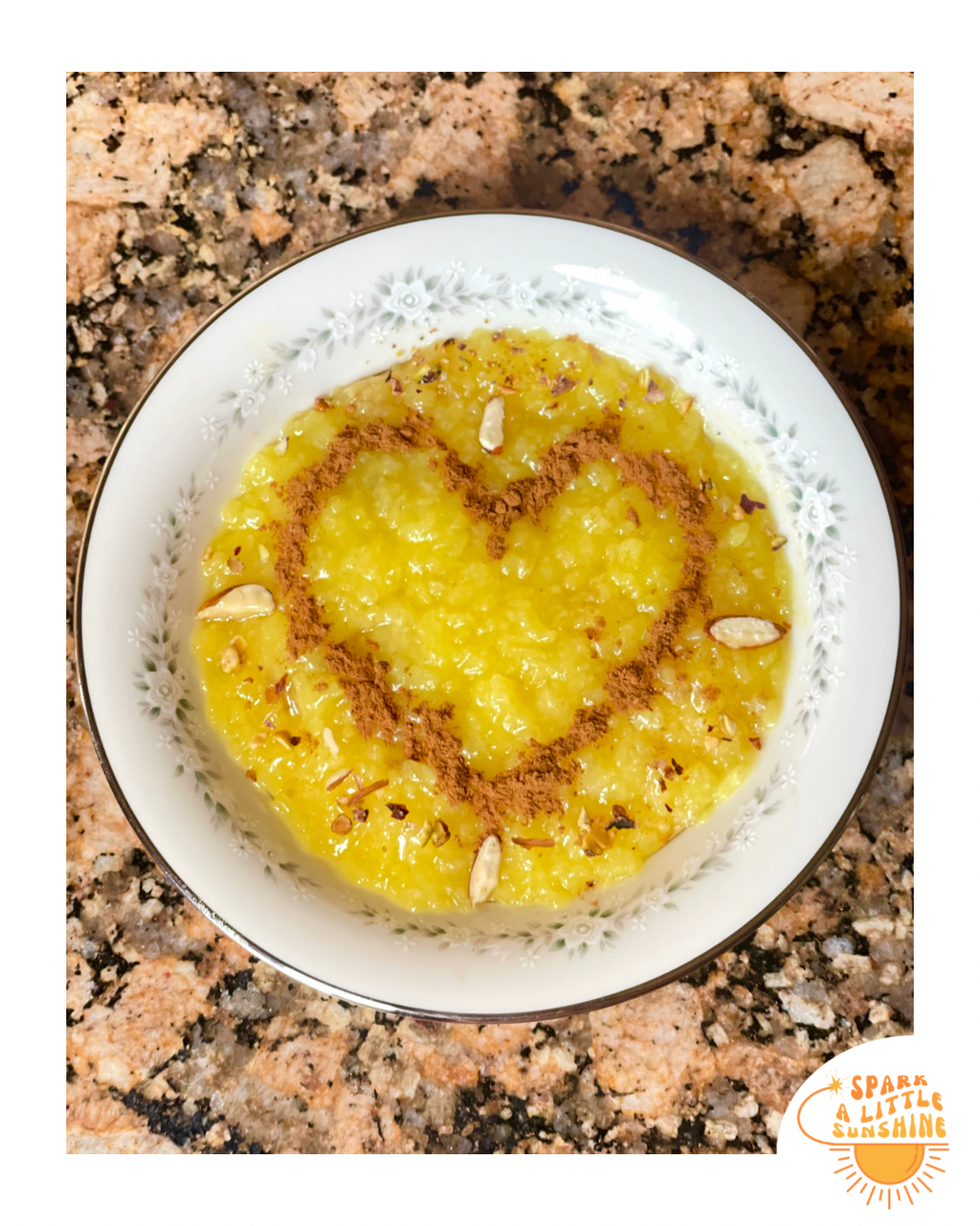 - Presentation & Devouring: This dessert is sweet and flavorful so a little goes a long way to hit the spot. For a single serving size, I'd use a small dessert cup and cover the full top in a cinnamon layer then garnish with slivered nuts. I love the balance of the cinnamon with the sweet. If you are presenting the dessert, pour it into the desired share size bowl to scoop out at the table or keep in the larger temperature safe bowl for larger holiday gatherings. Use the cinnamon to design the top with a plaid checker shape, other shapes, florals, hearts. Create flowers or trims with the nuts. Add a pop of pink/red against the yellow with edible florals or pomegranate granules. Have fun and make it with the beauty you want people to feel eeating it.