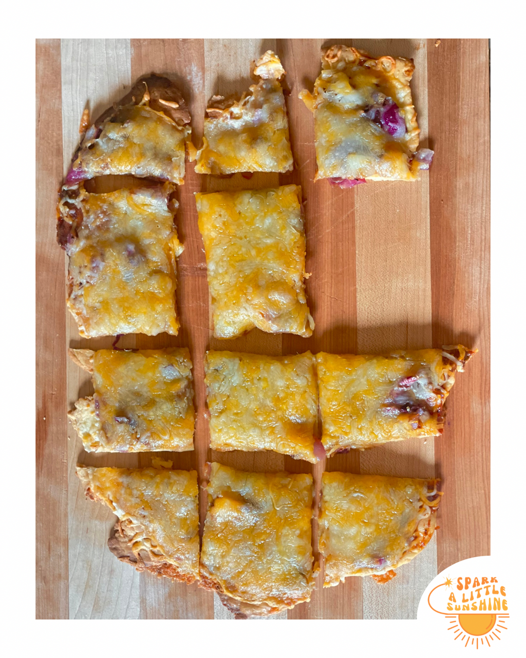 Toppings: Once you bring your freshly baked dough out of the oven, pour on your bbq sauce, top it with the caramelized onions and distribute the onions evenly across the pizza dough. Top with Mexican cheese (typically a blend of Monterray Jack, Chedder, Asadero, and Queso quesadilla cheeses). You can also add in a pepper jack for an extra element to the taste buds if on hand. Also optional for an extra flavor dimension and kick of protein, you can cook some Morningside Buffalo vegetarian chicken prior or while the dough is heating, then slice it up and add it on your pizza as well.