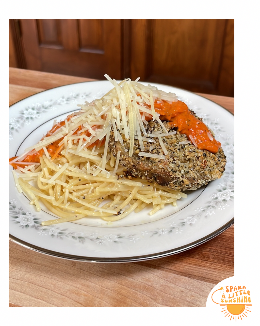 - Plate your noodles. Lay your eggplant on top. Add sauce to your preference. Garnish with Parmesan or nutritional yeast (if Vegan).
