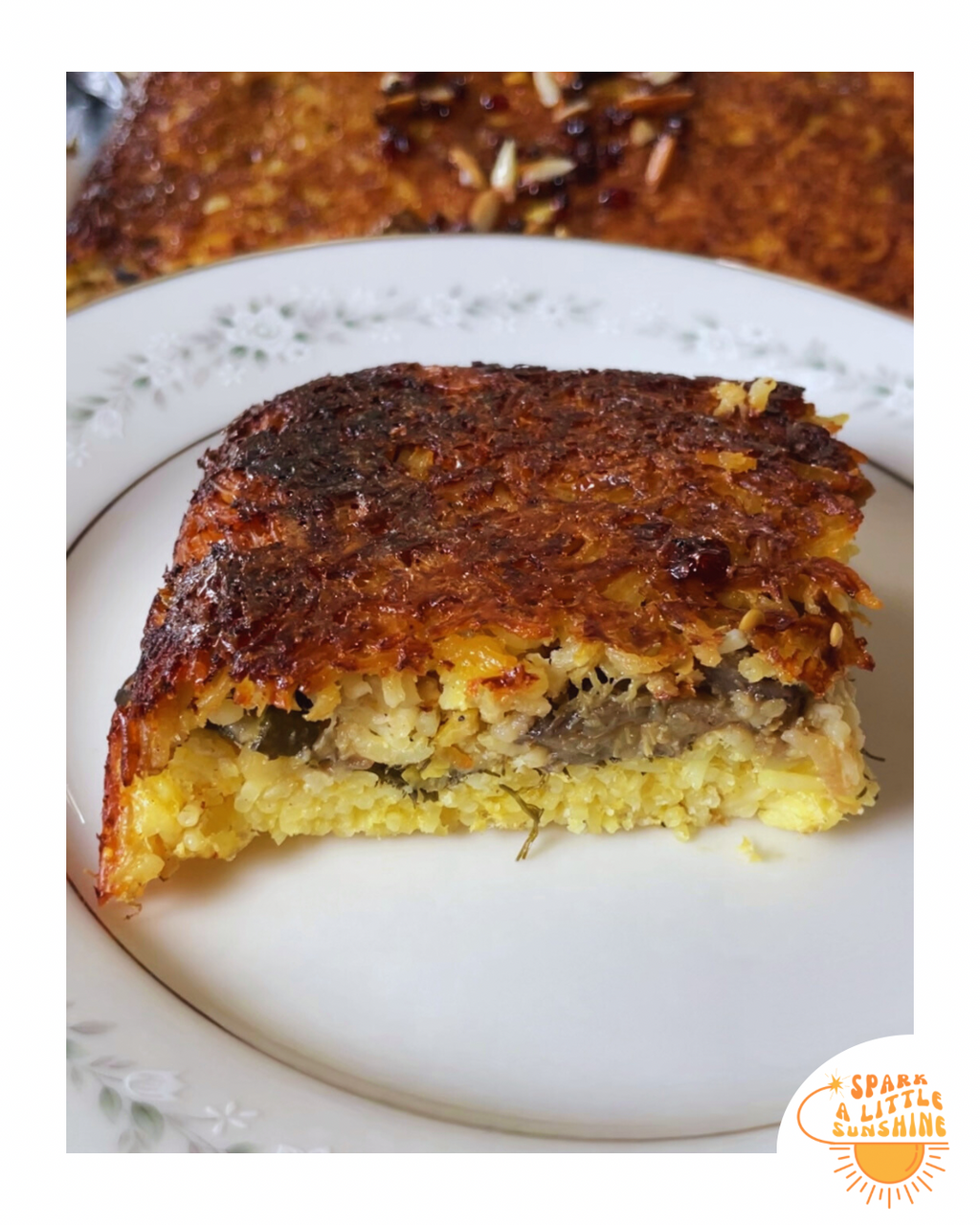 - Take out of the oven and remove the foil. While the dish is hot, take a large serving platter or cooking sheet pan over the rice dish, set on top, hold both and flip to invert the dish. Be careful to invert to both avoid being burned but also to maintain the proper formation of the dish. When inverted, the entire outer layer will be a golden tahdig- yummmm (if you know you know 😋😉), with all the softness preserved within.