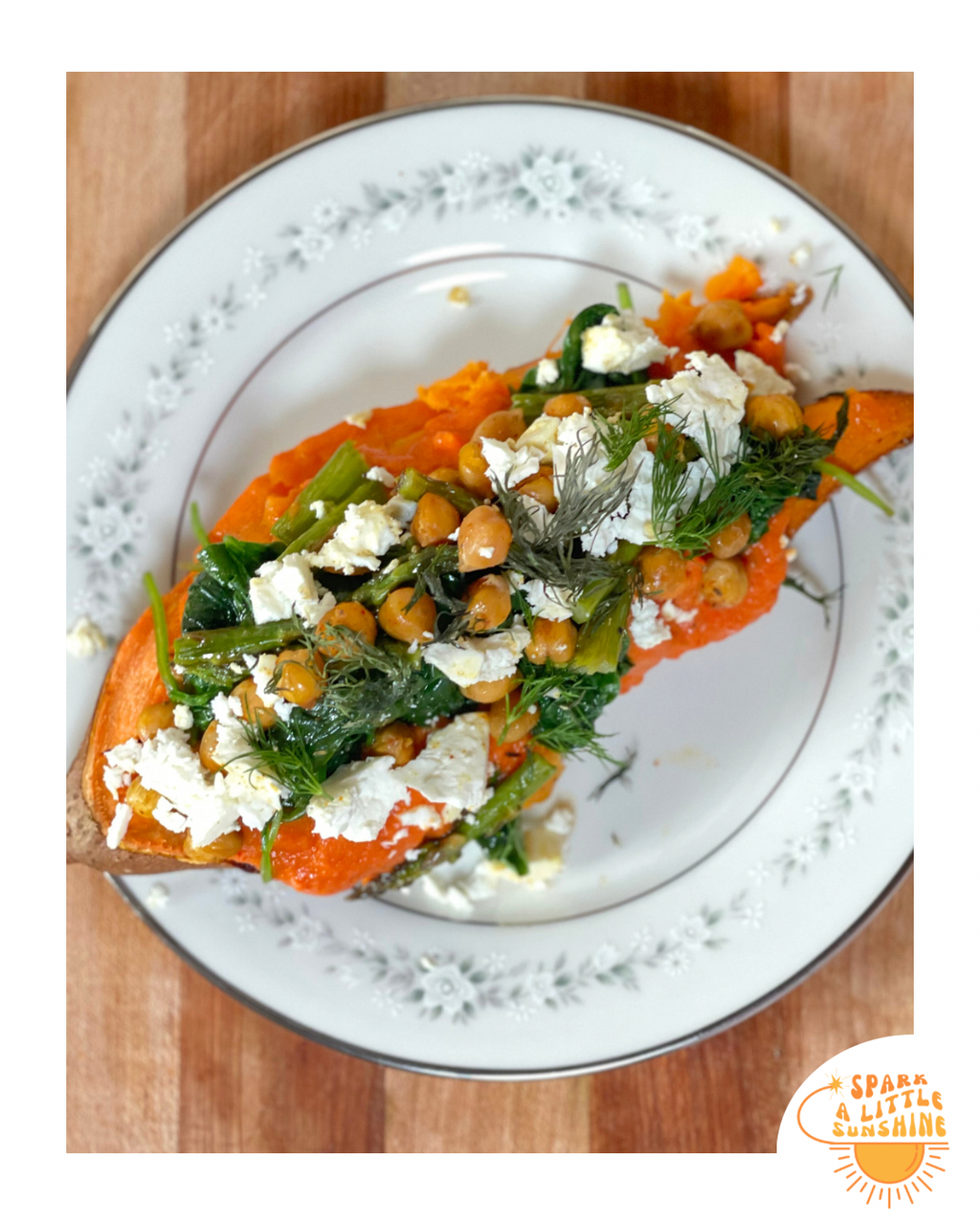 Grab a plate. Grab a roasted sweet potato half, pour on some Roasted Red Pepper-Tomato Chickpea Garlic Sauce, lay on your Spinach, layer your chopped Asparagus, toss on your season Roasted Chickpeas, garnish with your Feta crumbles.... Deeeeee- licious!